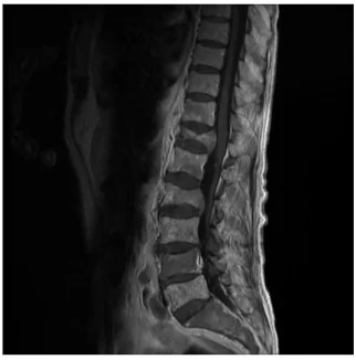 Imagine RMN al unui pacient cu fracturi tasare pe fondul unor metastaze vertebrale ale unui melanom malign.