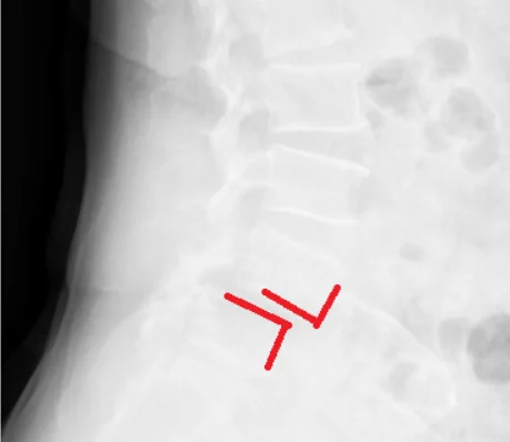 Radiografie din incidența laterală ce demonstrează spondilolisteza L4-L5 la o pacienta în vârstă de 54 ani.