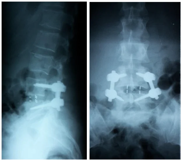Radiografii din incidența anteroposterioară și laterală ale unui pacient cu spondilolistezis L4-L5 ce a suferit o intervenție chirurgicală de decompresie și fuziune intercorporeala posterioară transforaminala cu șuruburi pediculare și cage PEEK (PLIF)
