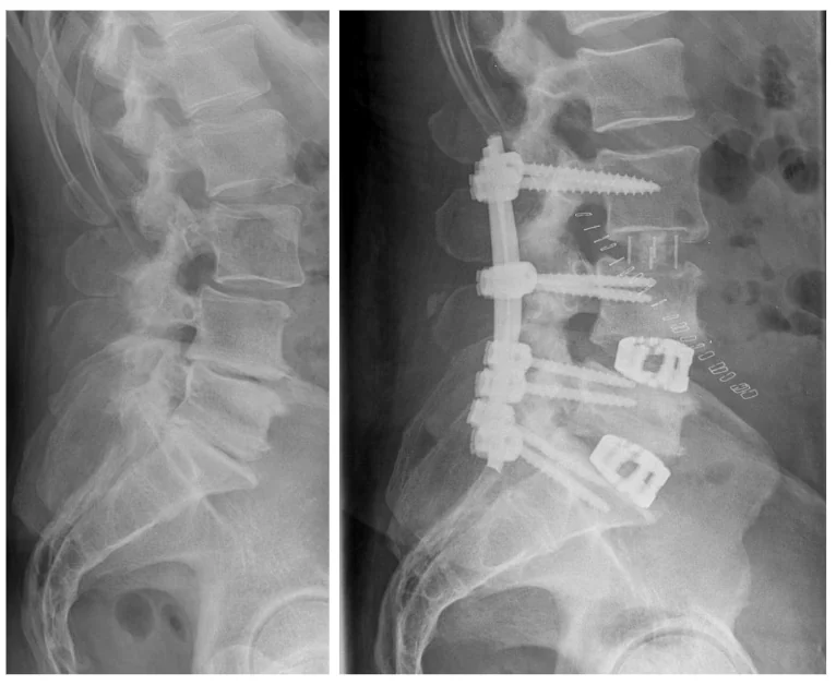 Radiografii din incidența laterală preoperator si postoperator ale unui pacient cu spondilolistezis L3-L4 si stenoza lombara multietajata ce a suferit o intervenție chirurgicală de decompresie și fuziune intercorporeala anterioara si laterala retroperitoneala cu cage-uri si fixare cu șuruburi pediculare L3-S1. Pe imaginea postoperatorie se observa corecția spondilolistezisului, refacerea lordozei lombare fiziologice, decompresia foraminala indirecta prin creșterea diametrului găurilor de conjugare.